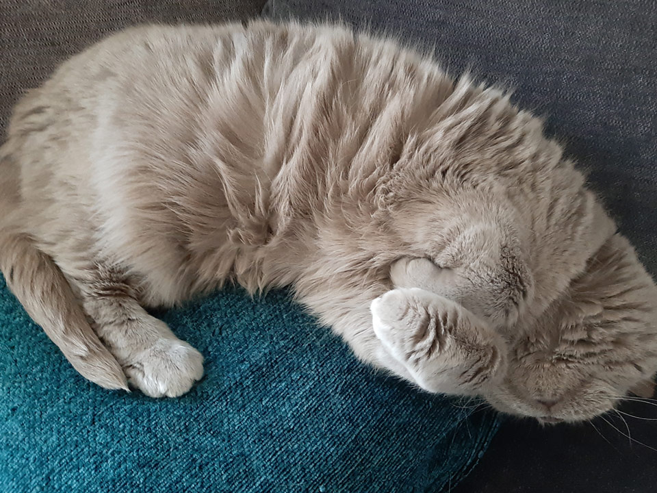 The only boy in the group, he is a large lump of a cat (often called The Unit) who loves chatting and cuddles. He is the typical dopey tom cat who likes nothing better than chilling out. He will quite often sit up mid-sleep and cry at you for some attention. He is father to Diva.